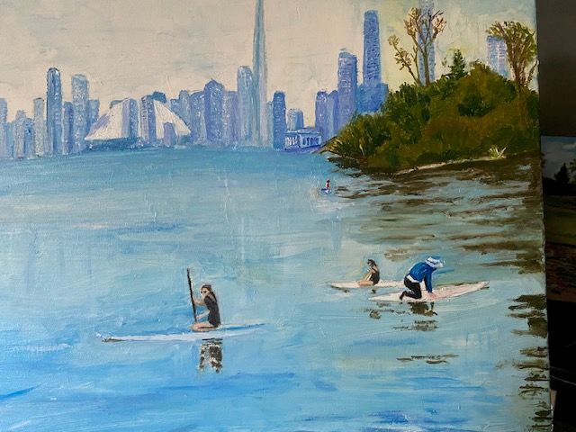 This summer we cycled to Centre Island on a bright sunny day. During our ride we came across a group of paddleboarders and I snapped a couple of photos with the intent of turning them into a painting or two. I wanted to capture the light, and the tranquility of the scene.