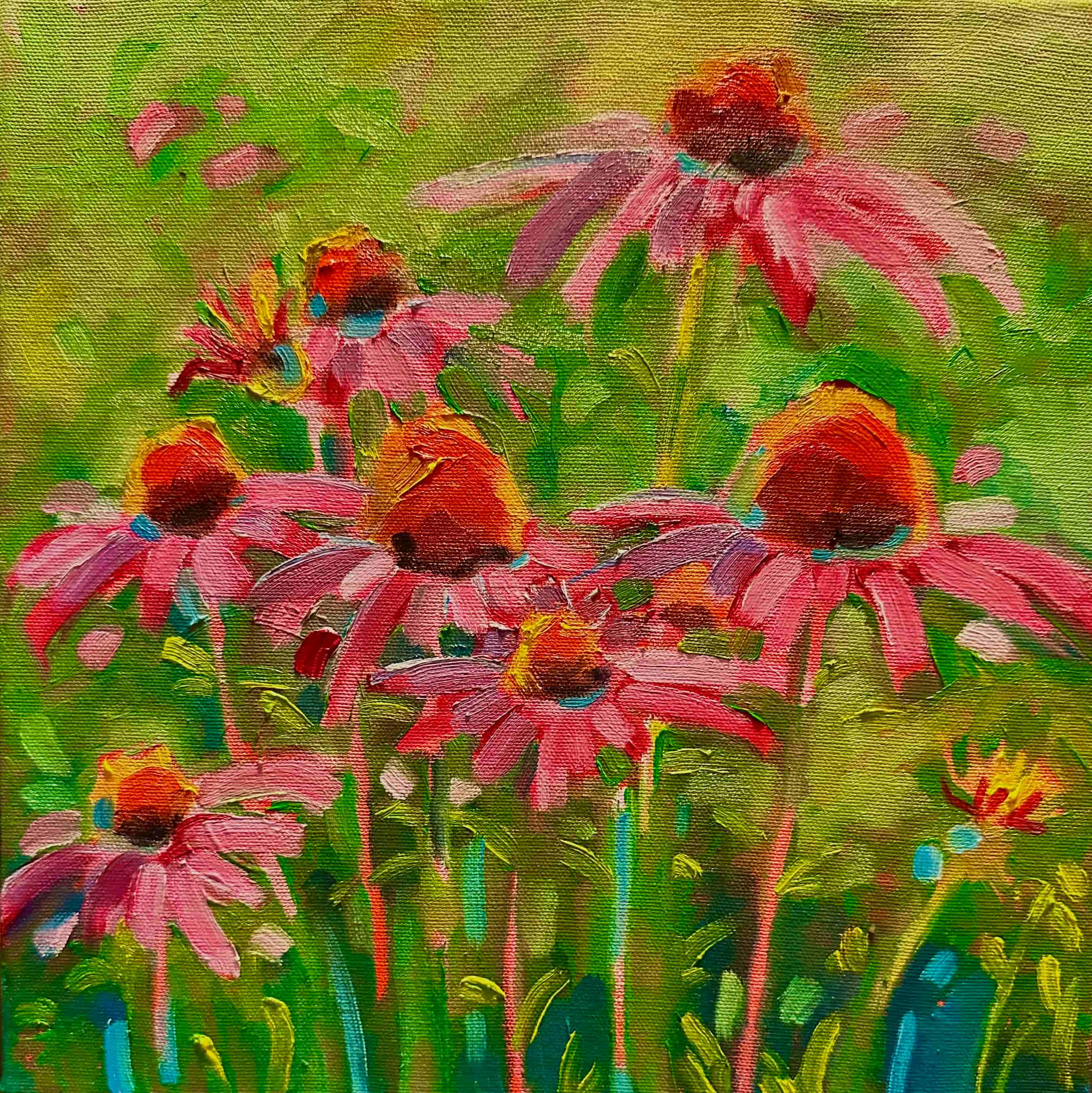 In Bracebridge, Ontario where the Trans-Canada Trail follows alongside the Muskoka River, there are several beautiful gardens of bright pink, glittering echinacea. This is one of several paintings that I’ve done of these lovely flowers lovely flowers. One of these square foot paintings was recently featured in a Muskoka magazine. gret.ourhouse@sympatico.ca gretjeens@gmail.com @gretchenjeens