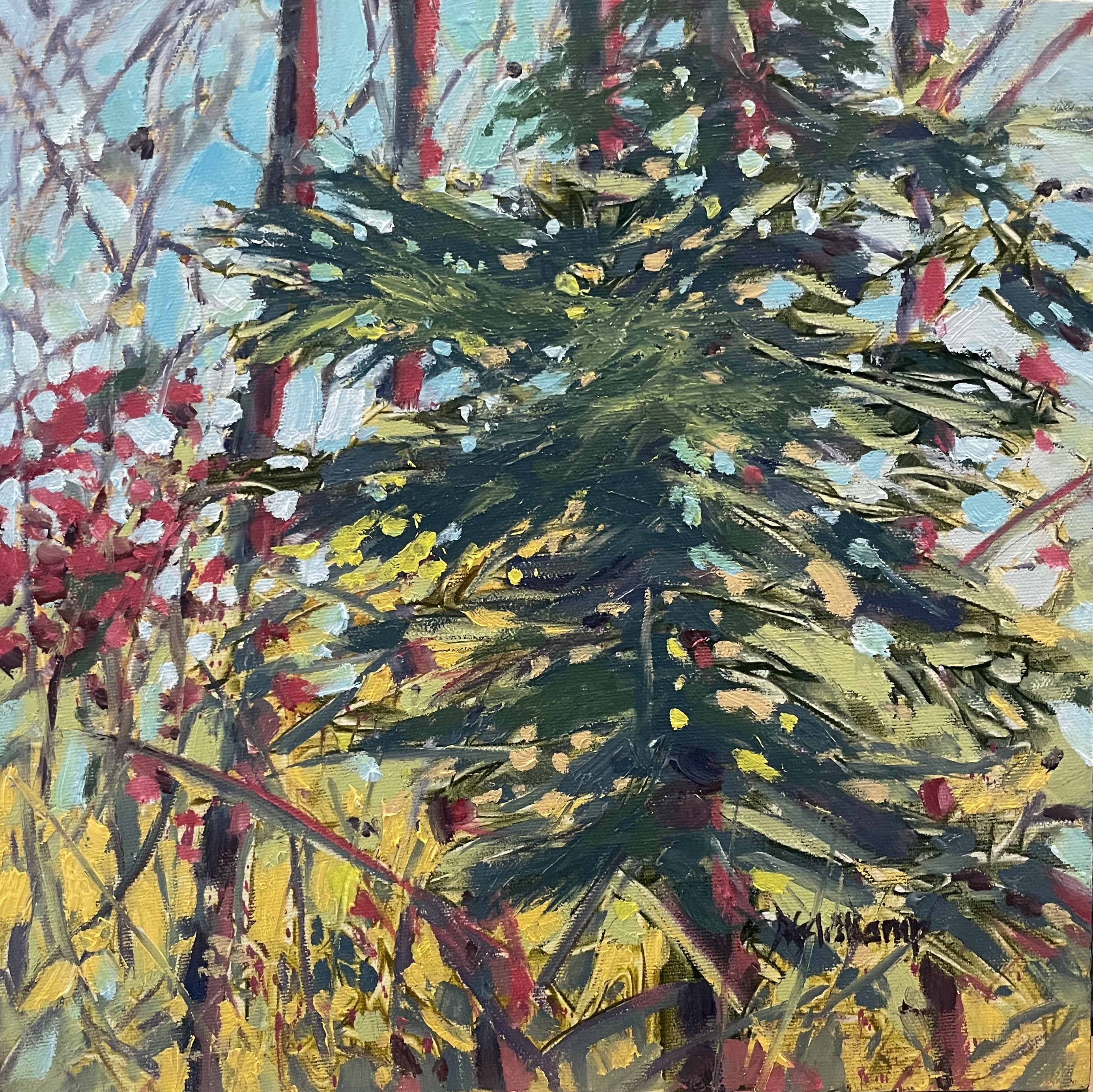 This colourful and fun painting is fresh and loose, depicting a swirl of changing colours in the fall.