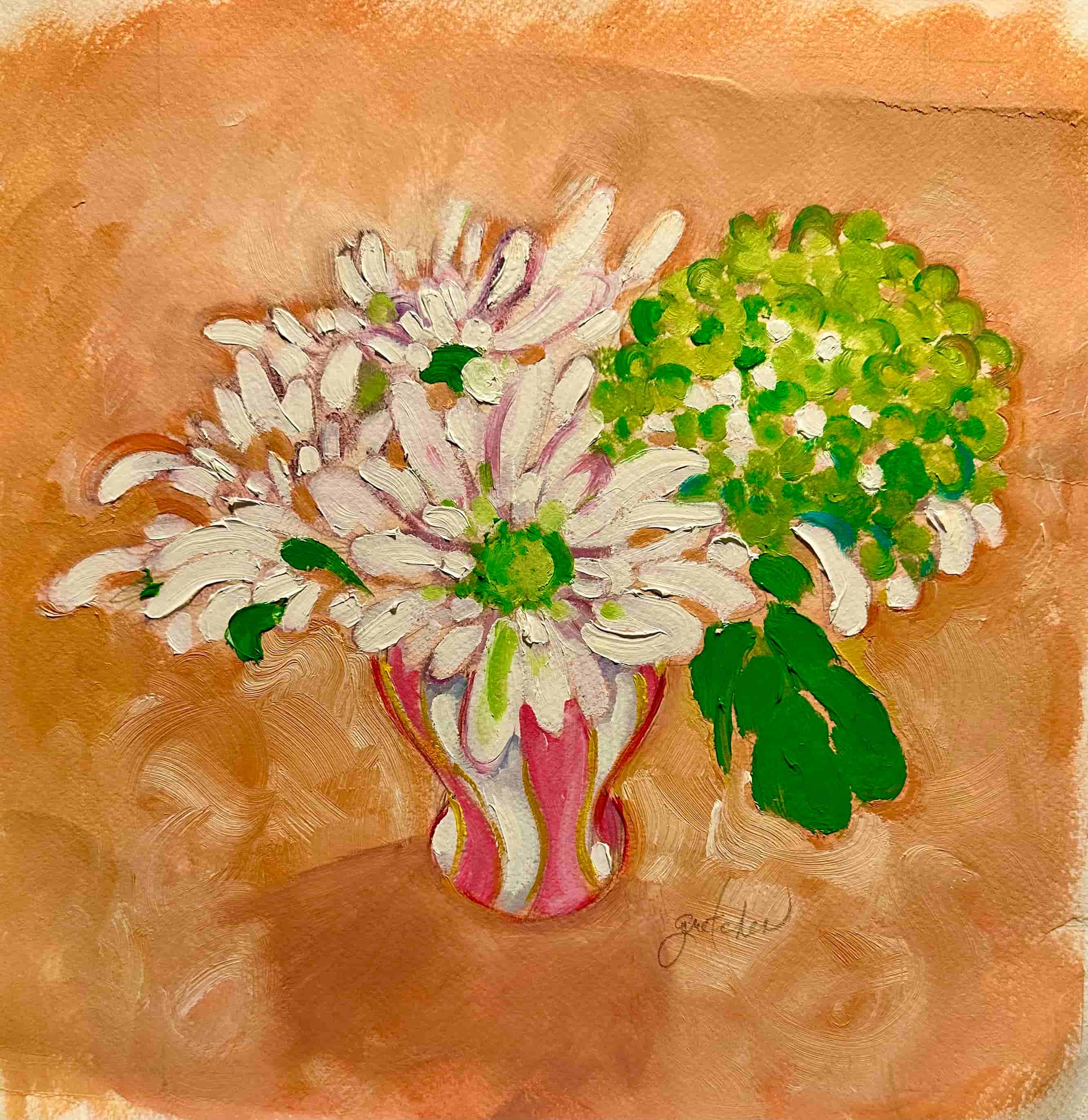 Daisies and Hydrangeas adorn a playful vase of pink and white stripes in this study using oil on paper. I love every kind of paper…it is my primary choice of surface for whatever medium I choose. I enjoy the way that oil paint so easily moves on watercolour paper. gret.ourhouse@sympatico.ca gretjeens@gmail.com @gretchenjeens