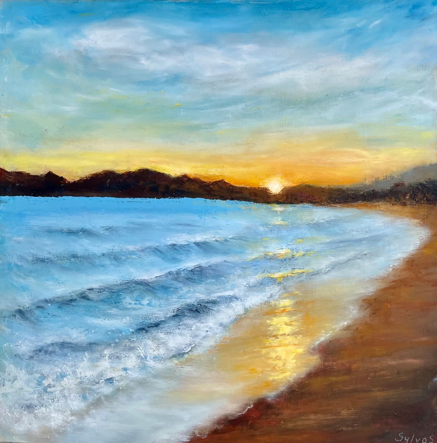 The sun dips toward the horizon over Cannes, casting a warm glow that dances across the gentle sea waves. Soft reflections ripple on the water, capturing the fleeting beauty of the evening. This serene scene invites viewers to pause and feel the quiet, luminous tranquility of a Mediterranean sunset. @artbysylva - Email: sylva@sroujian.com