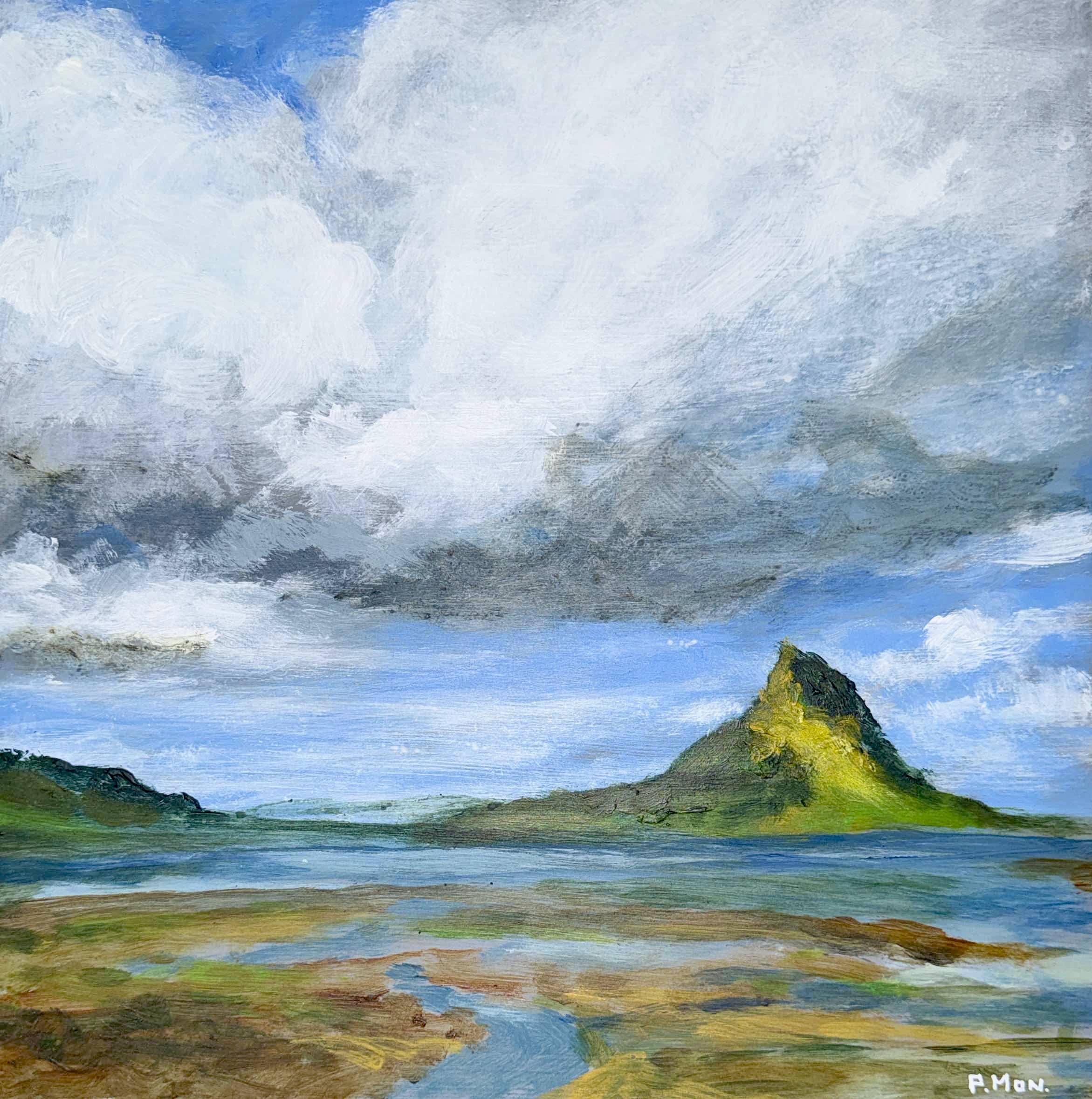 Cloudscape At Kirkjufell is a 12 by 12-inch landscape painting centered on a distinct mountain peak rising sharply on the right side. The slopes catch sunlight in gradients of green and yellow, contrasting with the earthy plain below. The foreground features winding water channels weaving through marshy terrain in muted browns, greens, and blues. Above, the sky expands with large, textured clouds shifting between white and gray, set against pockets of vibrant blue. The intent of this piece is to convey the movement of light and atmosphere around this Icelandic landmark, capturing the dynamic, ever-changing quality of natural light on land and sky. The brushwork embraces texture and color to evoke depth and natural complexity without overstatement. Working on color and layering textures was central to the process, seeking a balance between energy and calm within a compact format. The result invites reflection on how light sculpts landscape forms and reveals subtle atmospheric shifts.