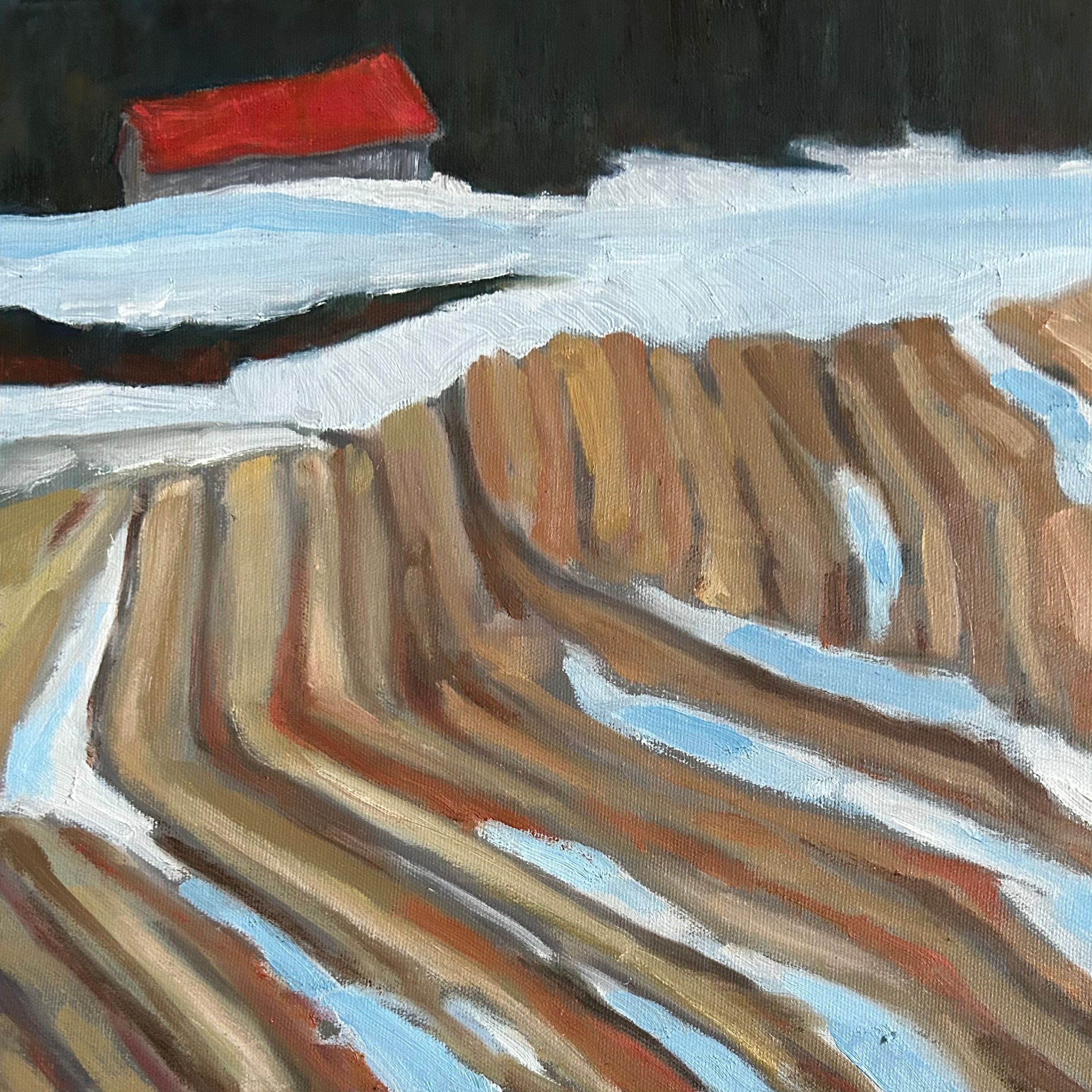 The earth starts to shed its winter blanket, showing off last year's furrows.