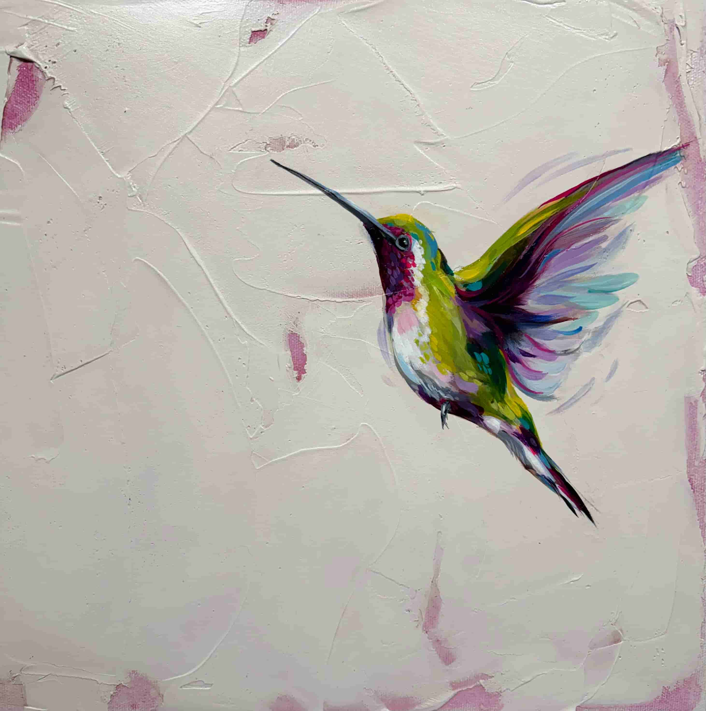 Hand painted in a rainbow of acrylics, Brittany captures the moment of a hummingbird in flight with a texturized neutral background with pops of purple peeking through. Instagram @brittanylaurenart www.brittanylauren.ca
