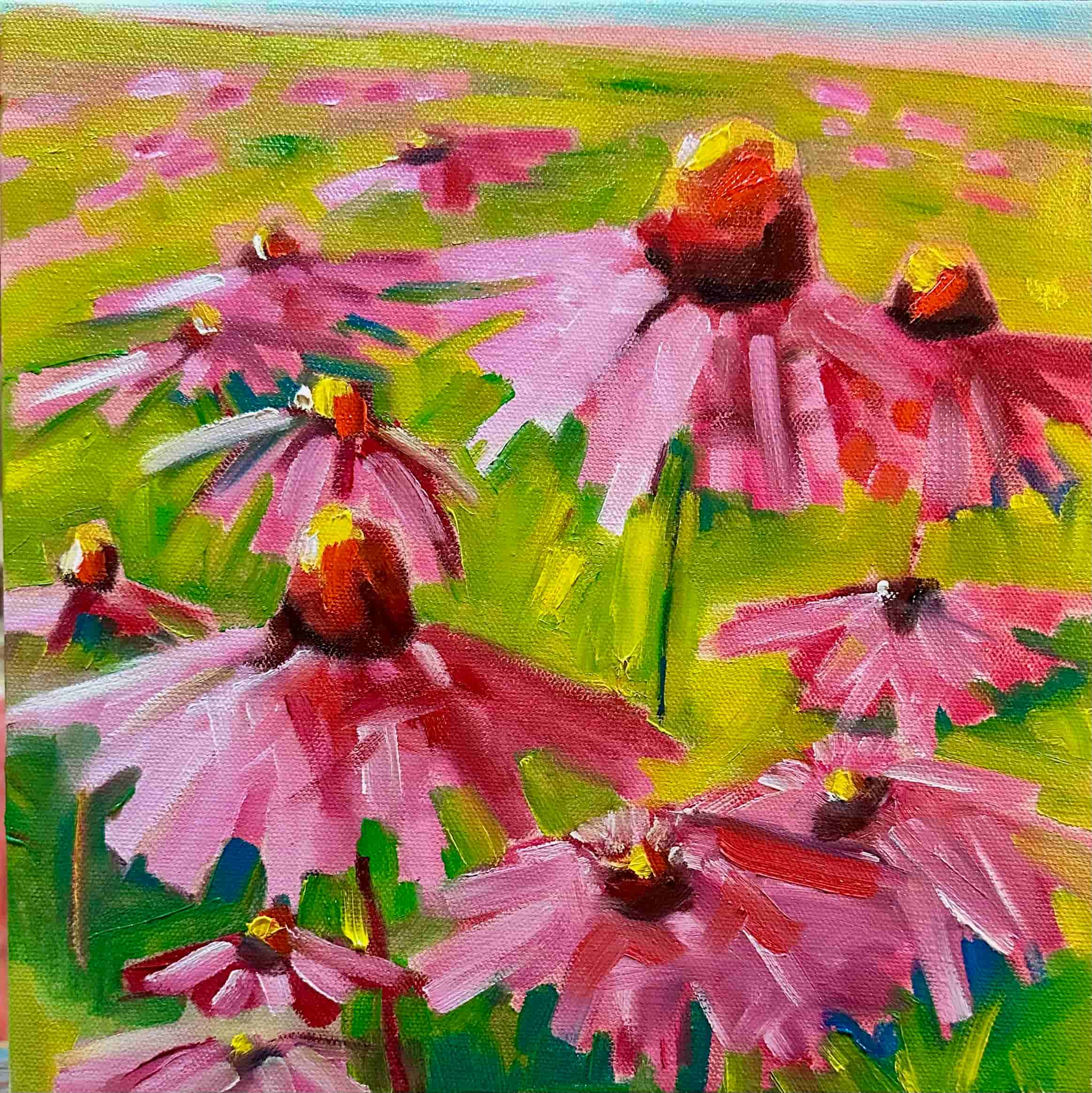 This is one of several paintings that I have done of the dreamy gardens of beautiful echinacea that are alongside the Trans-Canada highway and the Muskoka River in the town of Bracebridge, Ontario. One of these paintings was featured in the Unique Muskoka Magazine. Gret.ourhouse@sympatico.ca gretjeens@gmail.com @gretchenjeens