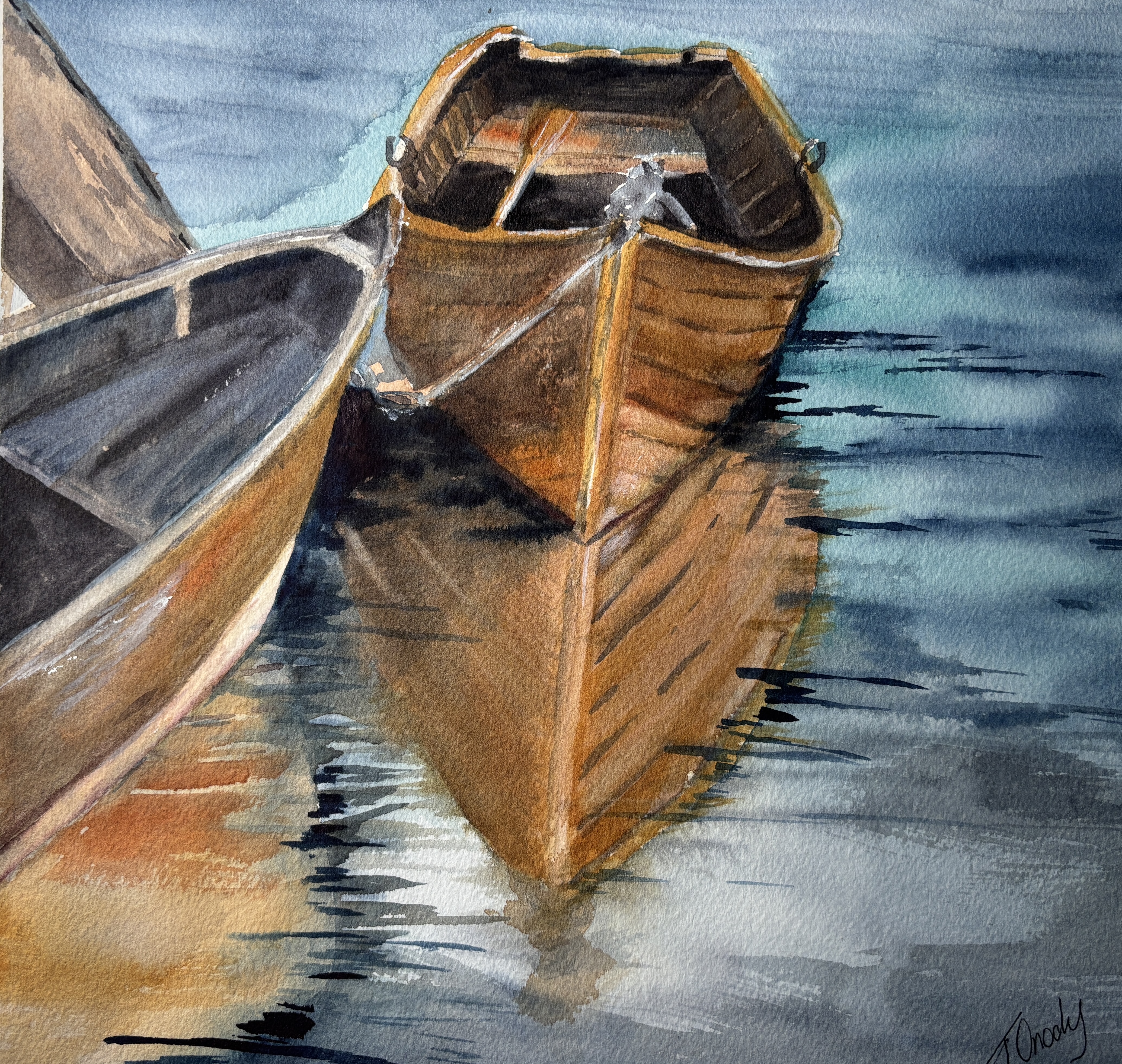 This piece is 10x10 matted and framed to 12x12. I was compelled to paint these two old boats at the end of summer. They reminded me of two old friends, forgotten until they meet again. Contact me through my website at www.judyonodystudio.com or jonody2@gmail.com 437 999-5568