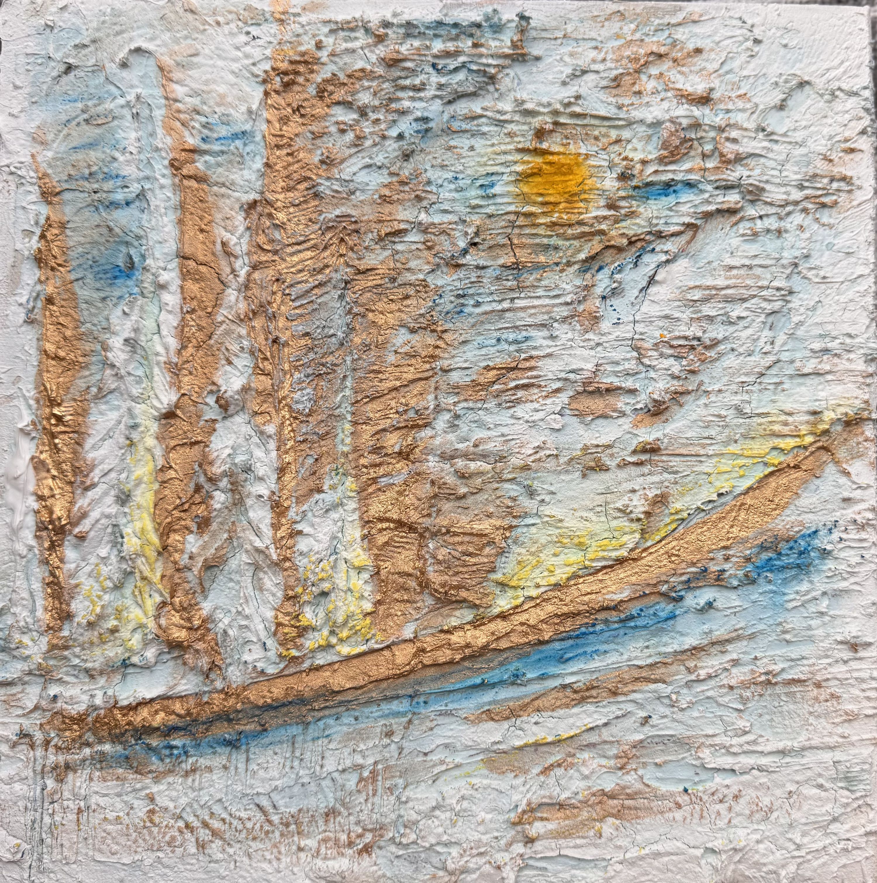 A serene, airy textured artwork blending soft whites, sky blues, warm golds, and copper tones. The raised strokes create a sense of gentle movement—like sunlight brushing across water or a warm breeze drifting through an abstract landscape. It feels peaceful, radiant, and full of quiet morning energy.