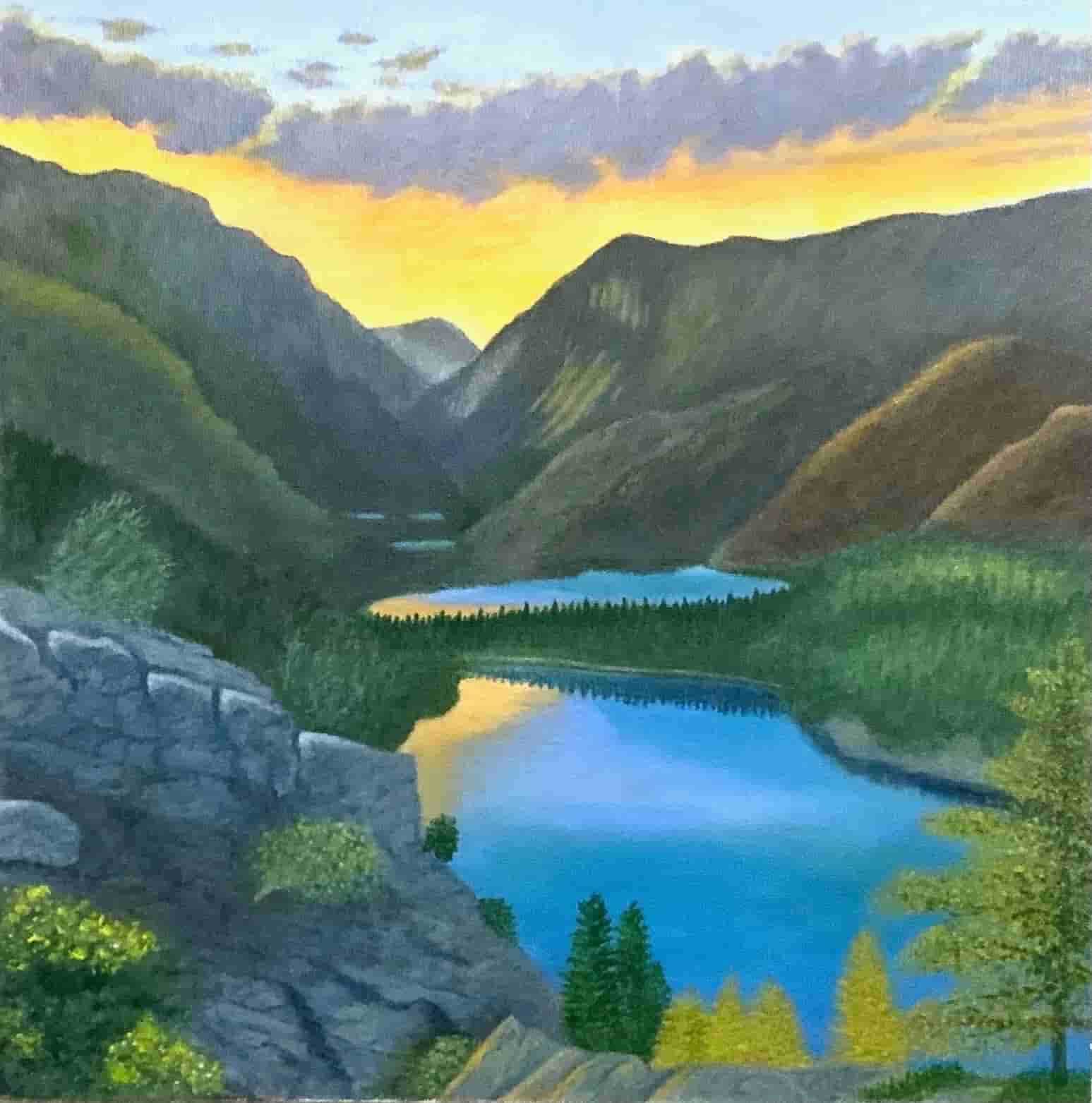 This work by Ed shows the variety of nature at this major US national park in Montana. The painting encompasses everything a landscape would want - mountains, skies, lakes, trees, terrain. Nestled in all this scenery is Grinnell Lake.