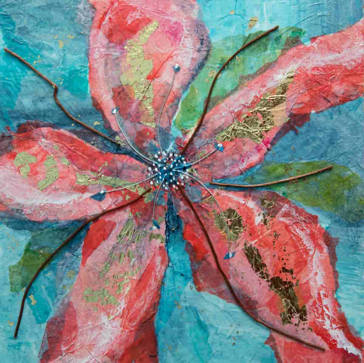 Art ImageArtwork media Mixed MediaArtwork Descriptionhttps://www.instagram.com/beaglesofballantrae/ beaglesofballantrae@gmail.com https://beaglesofballantrae.ca/ A vibrant floral study using hand-painted tissue papers, beads, cord, and gold leafArtwork price 300Artist Last NameGreenway