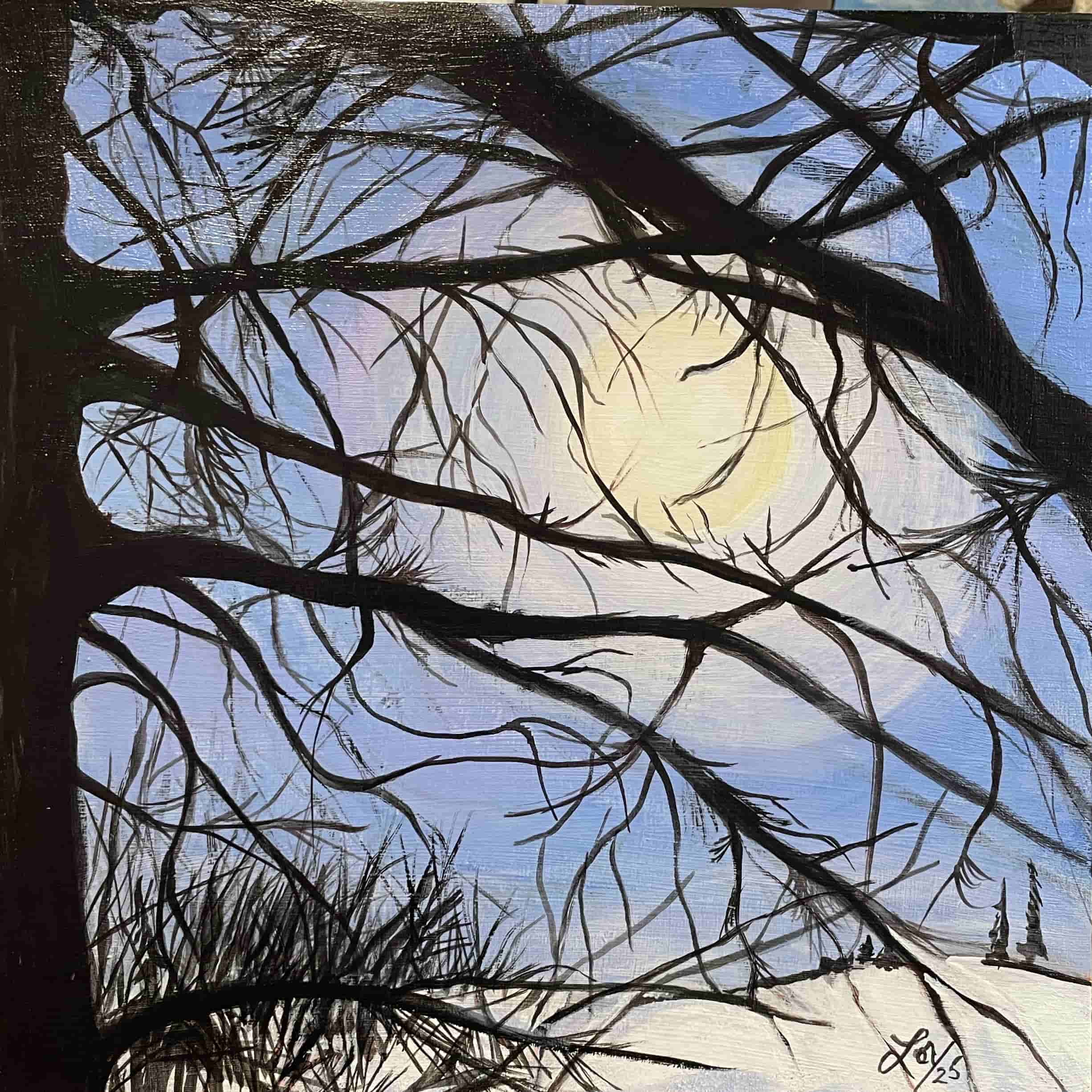 Art ImageArtwork media Acrylics on Wood PanelArtwork DescriptionThe magic of moonlight seen from the forest below ~ lori.mcbrien@sympatico.caArtwork price $275Artist Last NameDanyshyn-McBrien