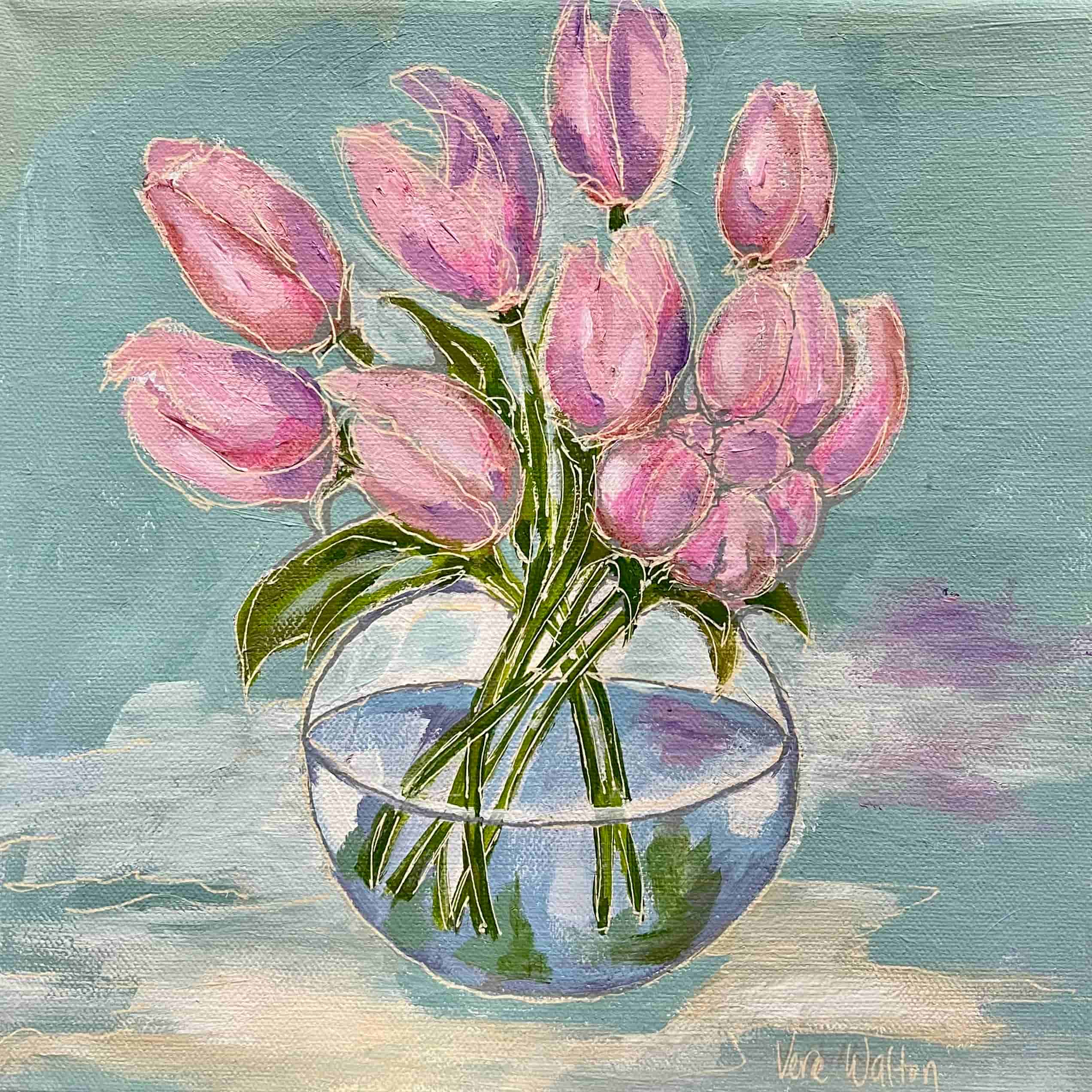 Gentle soft pink tulips arranged in a clear water bowl convey a sense of freshness and fragility. Set against a background of muted greens and blues the bouquet stands out prominently. www.verawalton.com verawalton@gmail.com