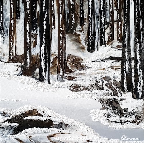 "Scenic Illusion - twenty four" - a semblance of pathways through a winter forest. Derived from collaging with random images formed by poured and cured acrylic skins. Then enhanced through the application of additional paint and acrylic mediums, to create a scenic illusion. See more works at olivana.ca Follow on Instagram - artbyolivana