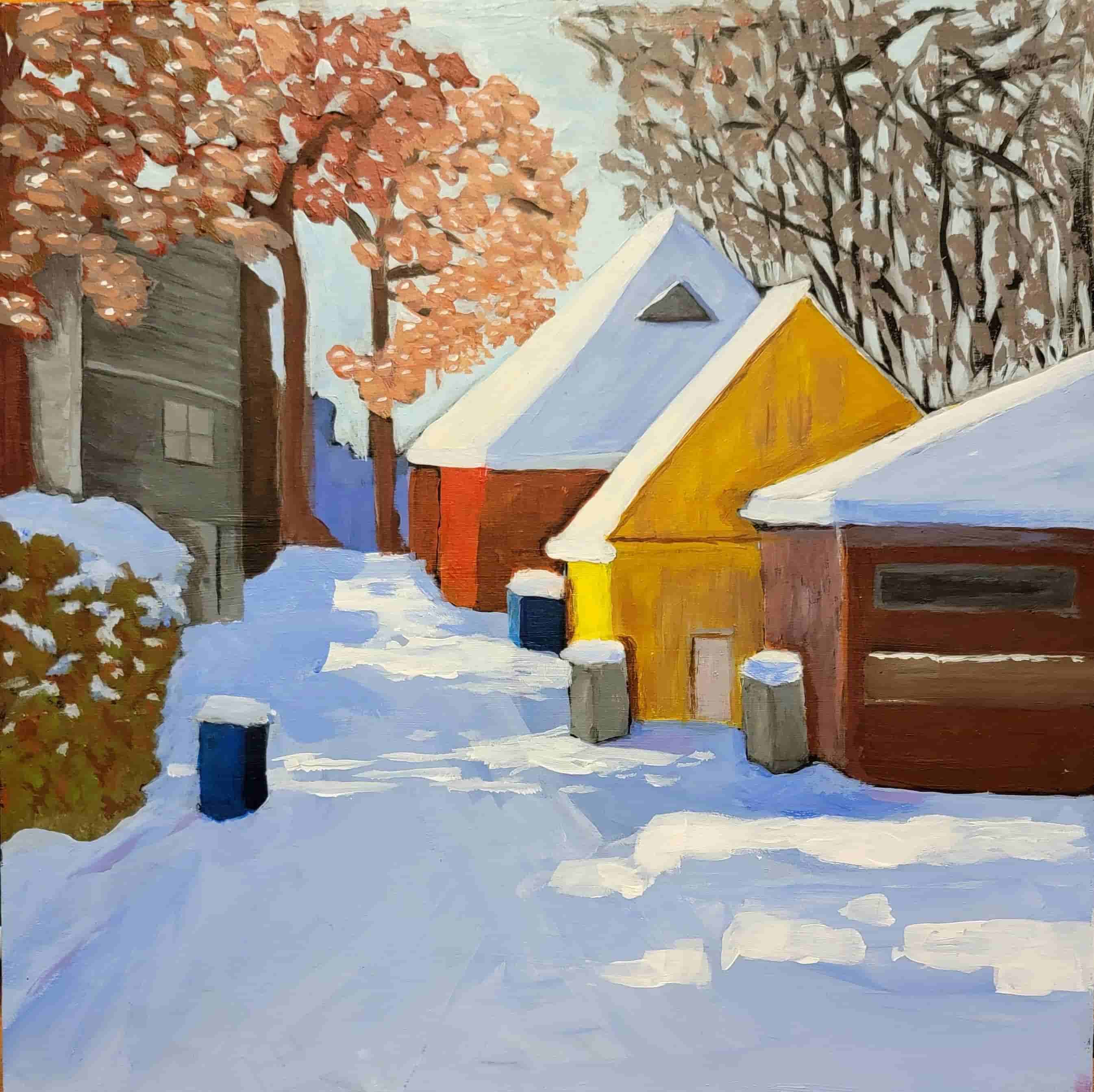 This painting captures the quiet beauty of a sunny winter day, where the light dances across fresh snow and illuminates a narrow alley lined with houses. Soft shadows, crisp highlights, and subtle colour shifts bring the cold air to life, creating a peaceful moment suspended in time. The scene evokes the calm of winter mornings and the quiet stories hidden within familiar neighbourhood spaces. About the Artist: Dina Anastasakos is a Markham-based artist who works in acrylic and watercolor, exploring light, colour, and the quiet moods of everyday environments. Her paintings reflect a love of atmosphere and a desire to capture small, meaningful moments within ordinary places. Instagram: @phos_art_studio