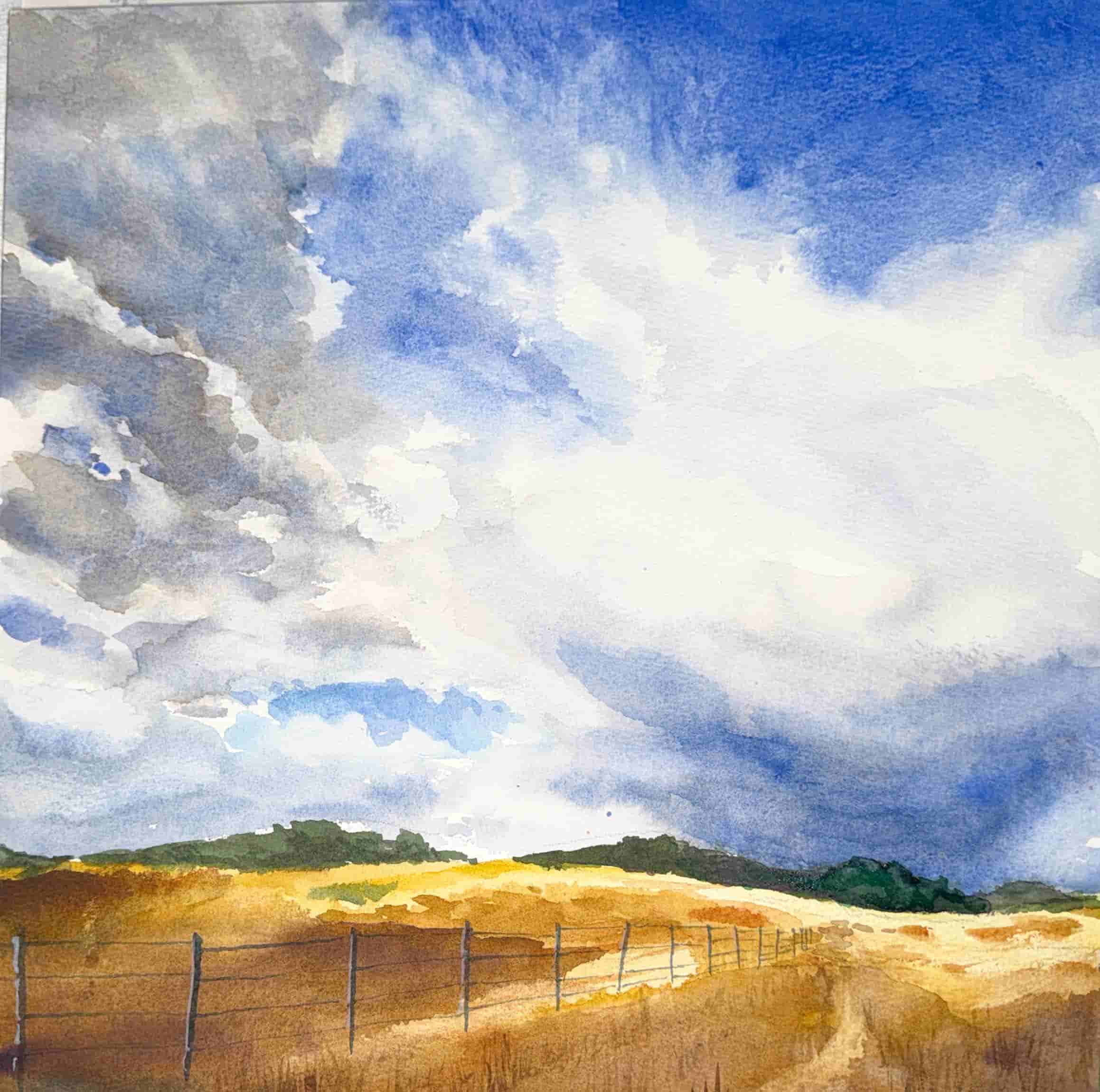 A luminous watercolor landscape capturing a wide-open sunlit field beneath a vast, expressive sky. Billowing clouds, shifting from soft whites to stormy grays, sweep over distant green hills and a simple fence line, evoking a sense of quiet solitude, changing weather, and endless horizons.