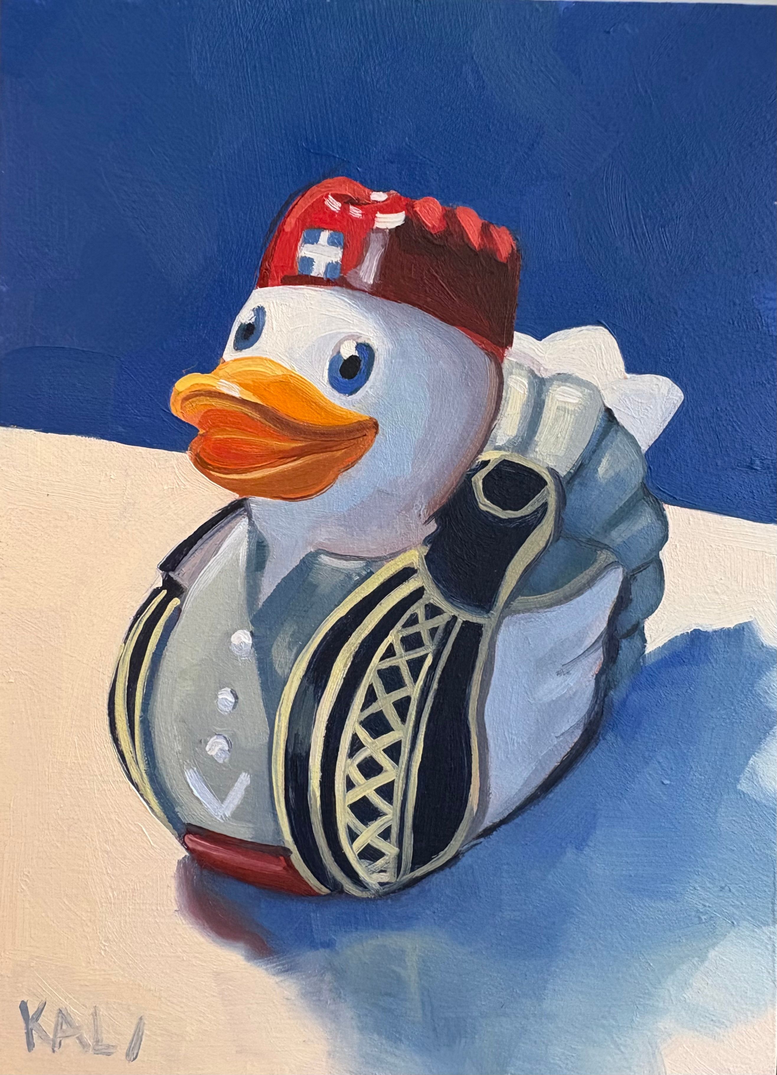 Art Image Artwork mediaOilArtwork Description"Evzone" the bathtub guarding duck, followed me home from Athens. Upon my return home, he staged a take over and demanded a formal portrait. Painted from life by @ThePaintingGreek.Artwork size 5"x7"Artwork price 200Artist Last NameKalianteris