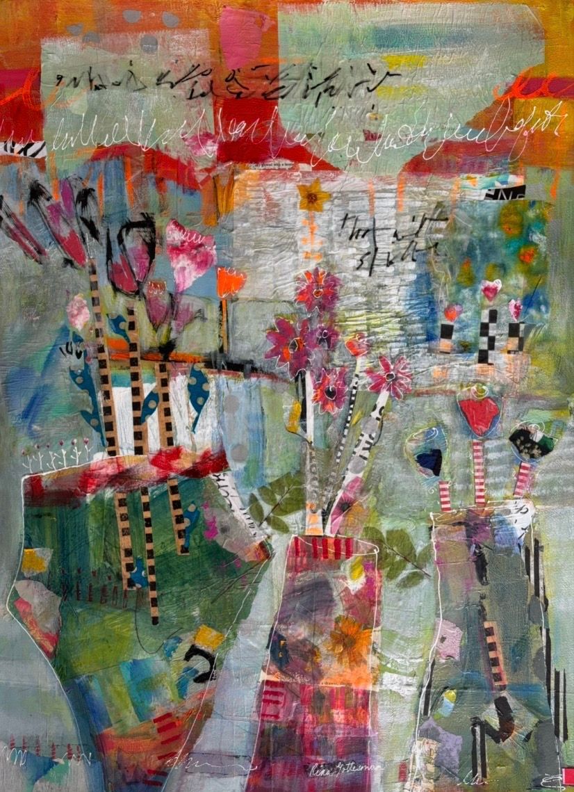Art Image Artwork mediaMixed media Artwork DescriptionDeep in conversation the three vases, filled again with fresh spring flowers, shared stories of the long cold winter that was finally over. 😊Artwork size 30x22 inches Artwork price 700Artist Last NameGottesman
