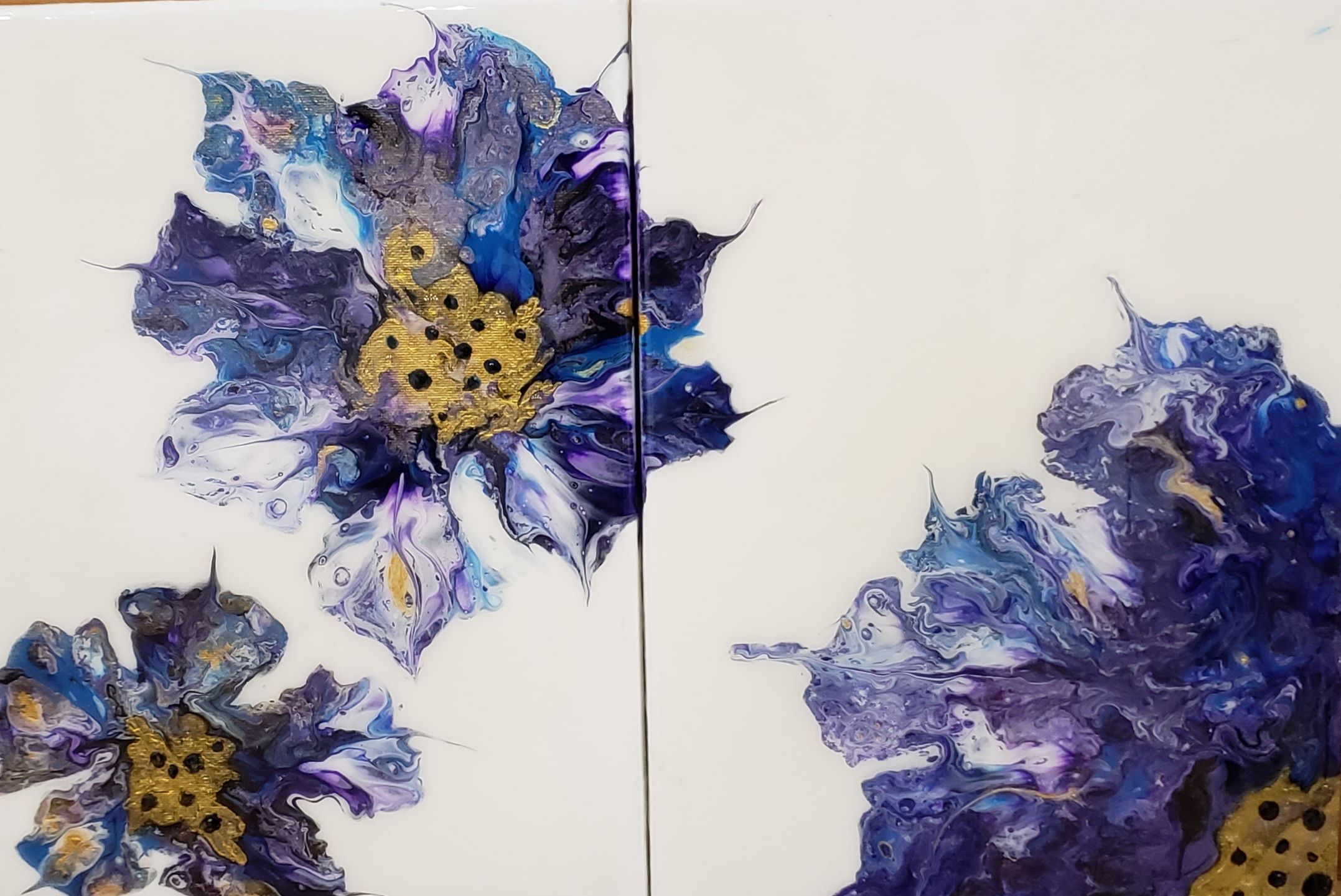 Art Image Artwork mediaAcylicArtwork DescriptionPurple Cosmos is an abstract dyptych flower painting on canvas. At the start of spring I enjoy watching flowers pop up in my garden and I enjoy using fluid art to paint them.Artwork size 12x18Artwork price 175Artist Last NameDonnelly