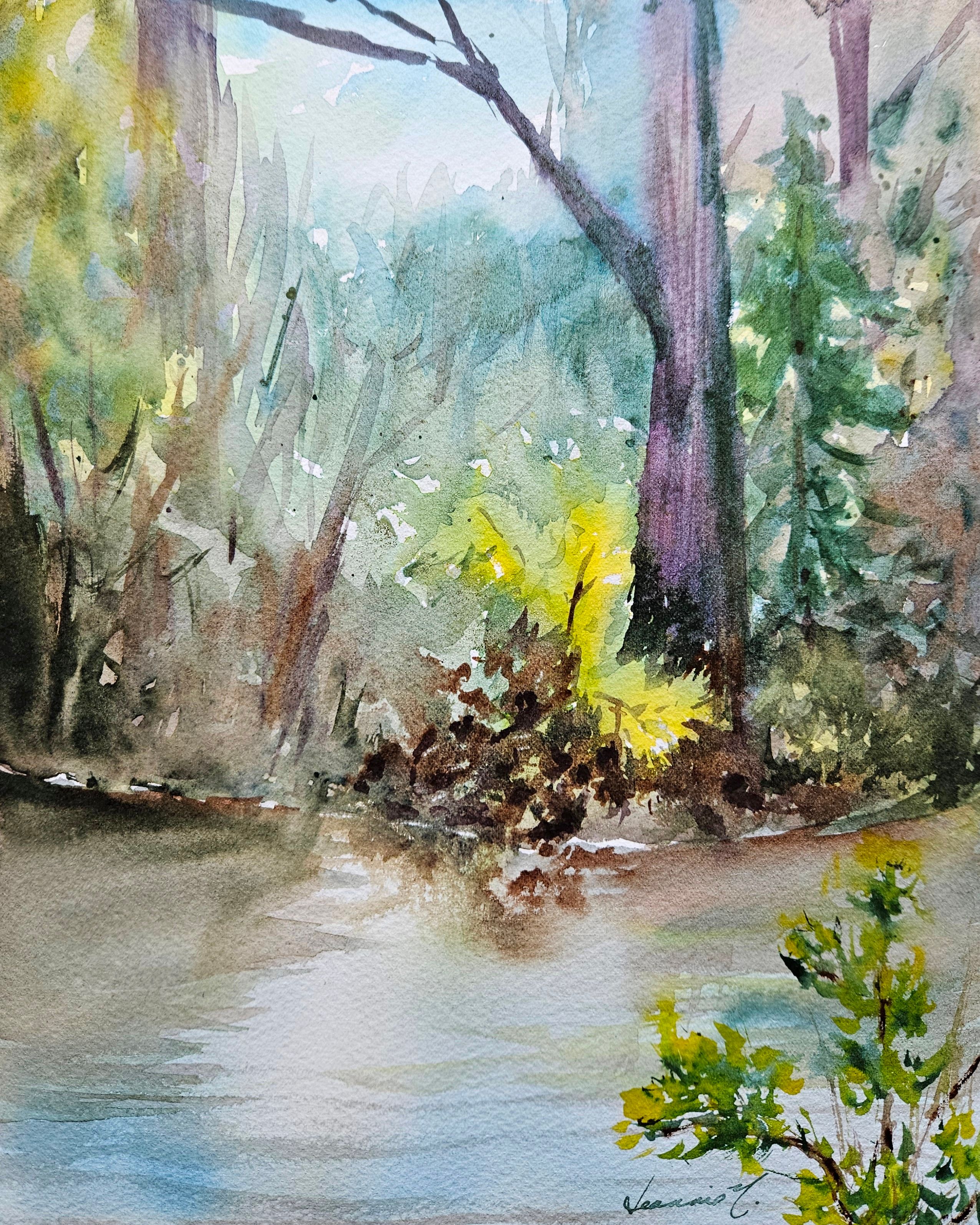 Art Image Artwork mediaWatercolour Artwork DescriptionAs Toogood Pond wakes up in spring, the new leaves unfurl and the woods glow with sunny blue skies. @jeannie.inthestudio Artwork size 10x8Artwork price 150Artist Last NameNicolaou
