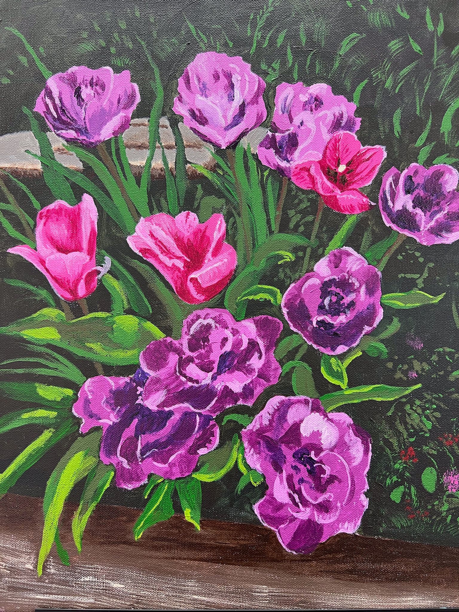 Art Image Artwork mediaAcrylic Artwork DescriptionStep through the Double Tulips in our Spring garden rich in bloom FB Stefhutchart IG Stephanie Hutchinson Art email stephanie.slyfe@gmail.comArtwork size 16x20Artwork price 300Artist Last NameHutchinson