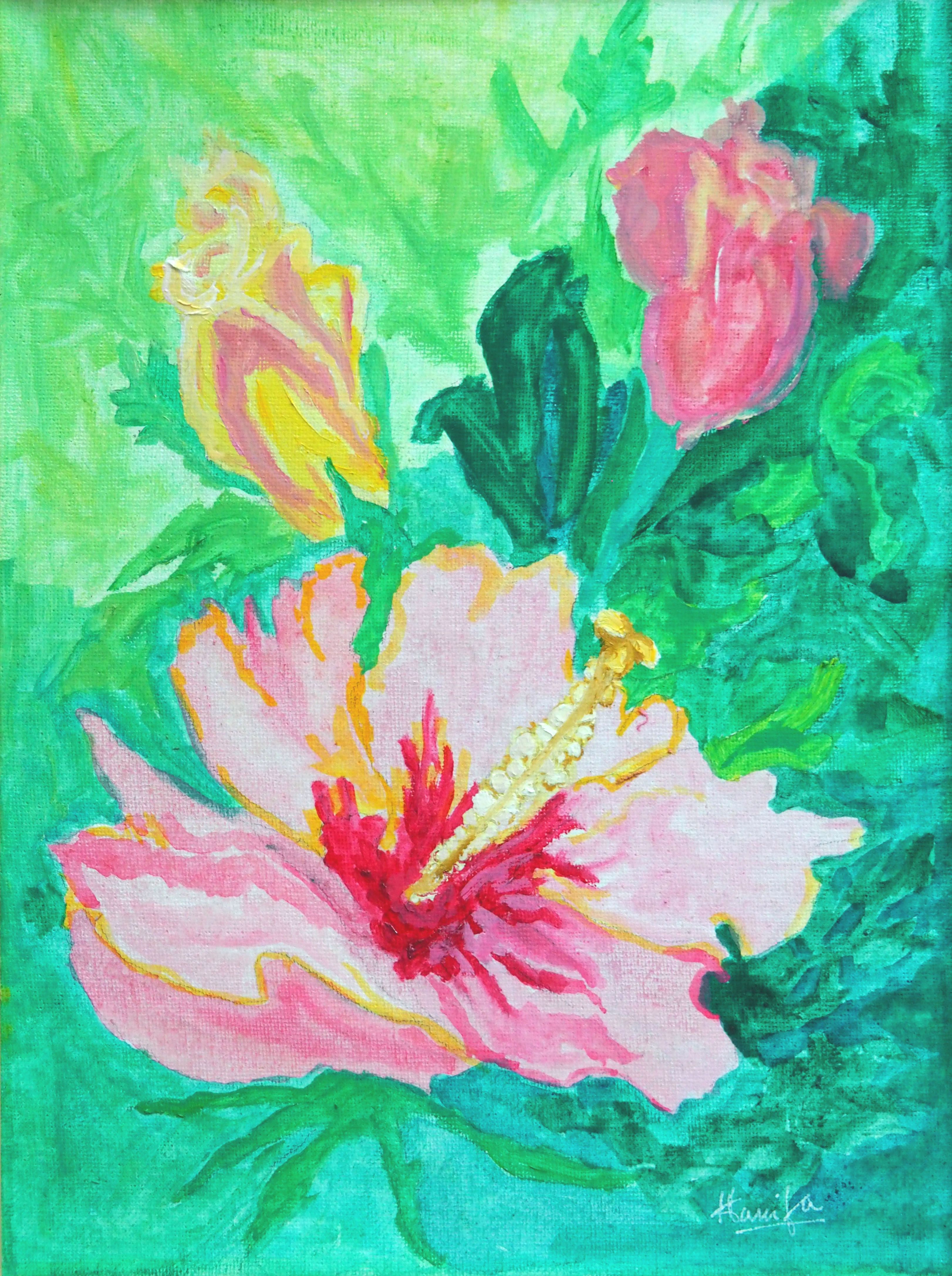 This floral painting is 12" x 9" unframed and 13.25" x 10.25" framed. The tonal images meld together in a delightful play of colours. Spring awakens our visual senses. The colours and thoughts turn to travel and gardening. This selection of art takes you to those moments – and will hopefully lead you to a joyfully time in your garden and exploring new travels. I know that each of these bring happiness and a smile to me.