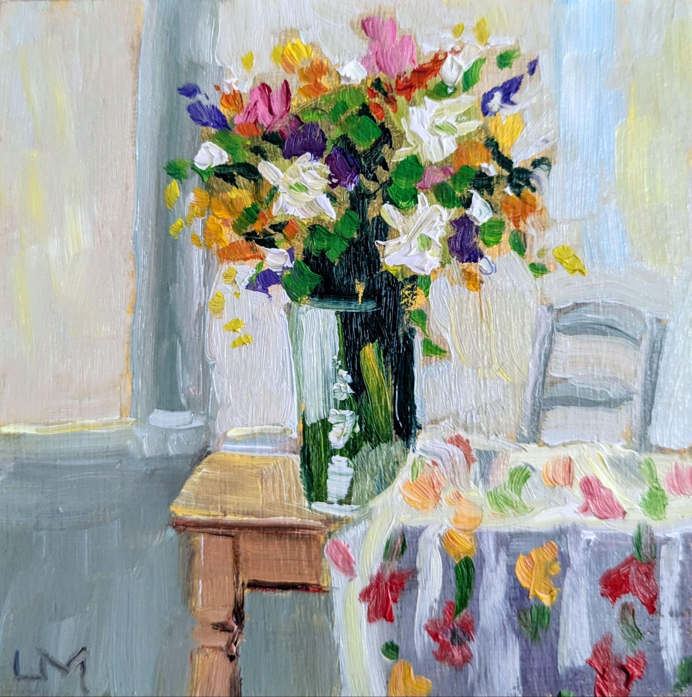 This is a big bouquet and a very small painting. It's a little bit of spring that can fit anywhere. For inquiries email Laurel Martin at cranberrycloud@gmail.com Or check out my other paintings at www.laurelmartin.ca