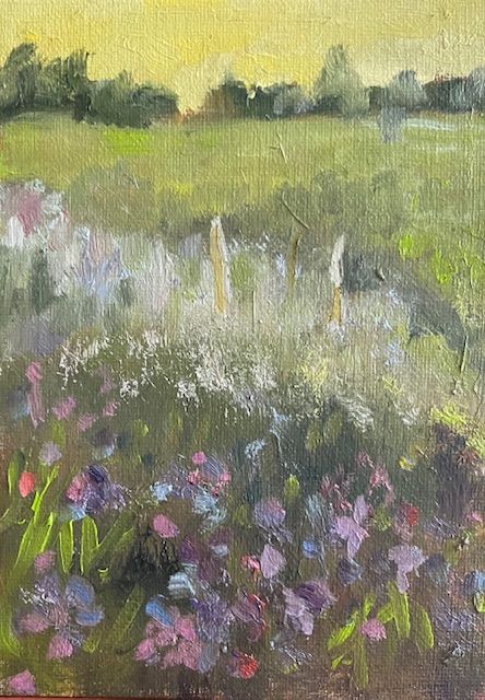 Art Image Artwork mediaOilArtwork DescriptionPlein air painting at an Uxbridge Flower farmArtwork size 5x7Artwork price 75Artist Last NameTraub