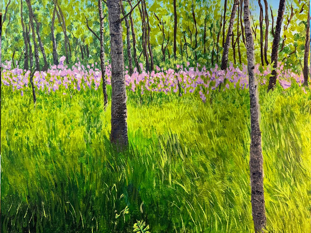 Art Image Artwork mediaAcrylic Artwork DescriptionWild Phlox nestled between the birches at the Country Club in Alberta Artwork size 16x20Artwork price 400Artist Last NameHutchinson